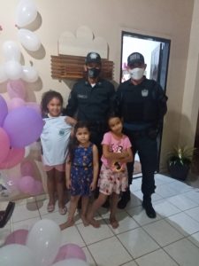 A Guarnição de Rádio Patrulha foi convidada pela Tia da aniversariante, que solicitou um mês antes, a possibilidade de uma equipe da Polícia Militar estar presente e prestar homenagem a sobrinha que ama os policiais e que um dia quer ser militar.