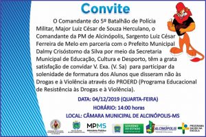 O comandante do 5º BPM, Major Luiz César de Souza Herculano e o Comandante da PM de Alcinópolis, Sargento Luiz César Ferreira de Melo convidam todos para a cerimônia de formatura do Programa.