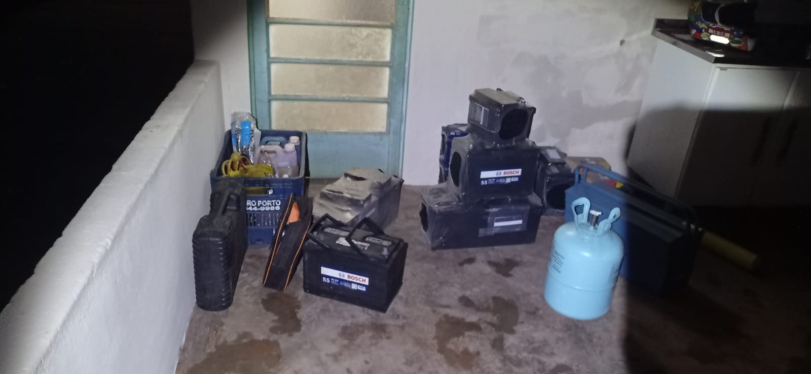 Durante busca veicular foi constatado que o mesmo pertence a uma empresa de manutenção de ar condicionado e teria sido abandonado com as chaves no contato e em seu interior diversas ferramentas, dentre: 01 cilindro de gás, 01 máquina marca Karche, 02 caixas de ferramentas, 01 compressor de marca Wap Pumper, 01 notebook, 01 programador PRRV e 01 instrumento de calibragem de ar condicionado. Após contato realizado com o proprietário da empresa, os policiais tomaram conhecimento que o automóvel possui rastreador e refizeram o trajeto que este teria transitado constatando que o veículo teria estado na Rua 28, no bairro vila piloto 05, em uma casa abandonada onde foi localizado mais produtos sendo: 11 baterias, 01 galão de gás R141B, 01 caixa de ferramentas com ferramentas, 01 balança, 01 prensa hidráulica e 01 maçarico para solda.