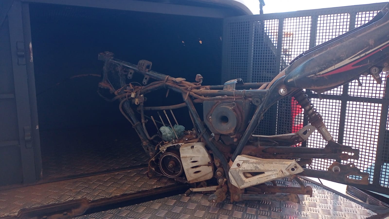 Nesta quarta-feira, por volta das 11h45, uma guarnição de radiopatrulha do 2º Batalhão recebeu informações versando a existência de uma motocicleta “depenada” nas proximidades da BR-158. Durante diligências obtiveram êxito em localizar a motocicleta JTA Suzuki Yes 125, cor preta, ostentando placa de Três Lagoas-MS, parcialmente desmontada, porém com sinais identificadores preservados.