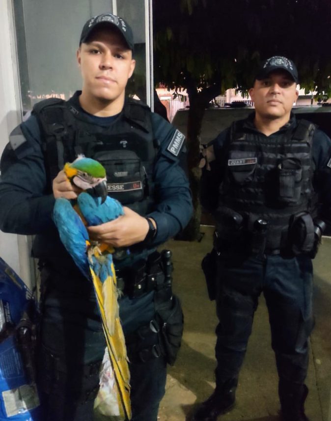 Os policiais solicitaram o apoio de um veterinário, que emprestou uma gaiola para a Arara ser remover para a Polícia Militar Ambiental de Coxim