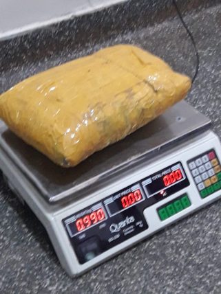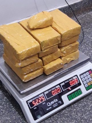 No decorrer da fiscalização, foi abordado um jovem de 23 anos, que transportava uma mochila, cor preta. Em vistoria na mochila, foram encontrados 5,225 kg de substância análoga à maconha e 0,990 gramas de substância análoga a bucha de maconha.