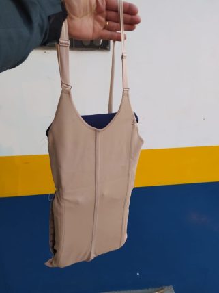 Os militares solicitaram que ela retirasse o casaco que estava usando, neste momento foi encontrado 06 embalagens, preso ao corpo, por uma cinta.