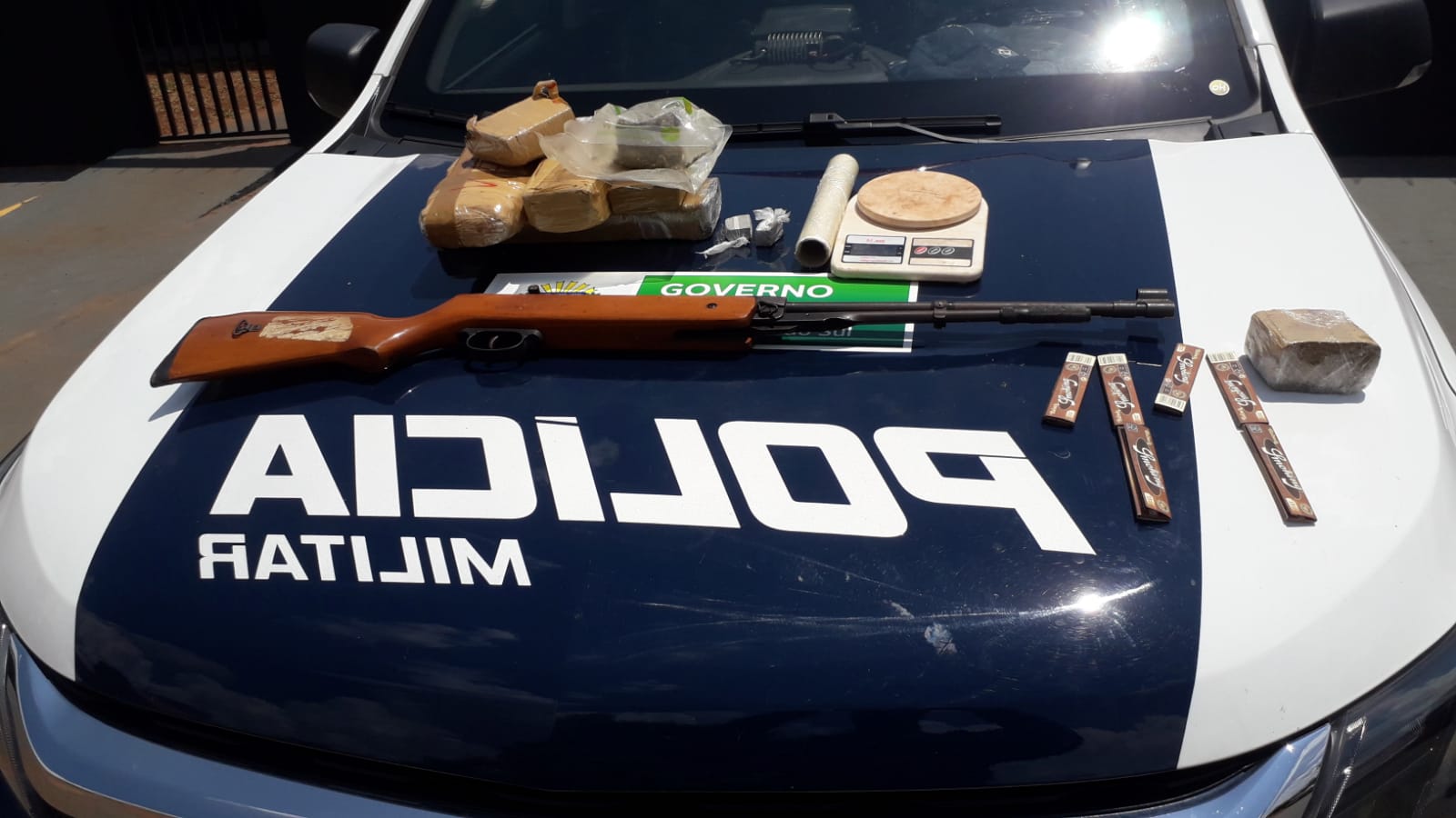 No veículo foram encontrados 9 tabletes de maconha e o homem indicou que em sua residência haveria mais entorpecentes. No local, na região do Moreninhas III, foram encontradas mais drogas, que somados aos do carro totalizaram 25,3 quilos de maconha divididos em 34 tabletes, além de uma espingarda com cabo de madeira aparentemente sem marca e calibre e diversos materiais para embalar e pesar entorpecentes, indicando que ali seria um ponto de comercialização de drogas.