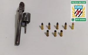 O primeiro fato ocorreu no final da tarde em Sete Quedas quando a equipe de Rádio Patrulha foi solicitada para dar apoio a um agente da Polícia Civil que tentava prender um homem de 33 anos que tinha efetuado disparos com um revólver na área central. Os policiais militares comparecerem em apoio, ajudaram na prisão do autor e apreenderam um revólver Winchester, calibre 38, com cinco munições intactas e uma deflagrada.