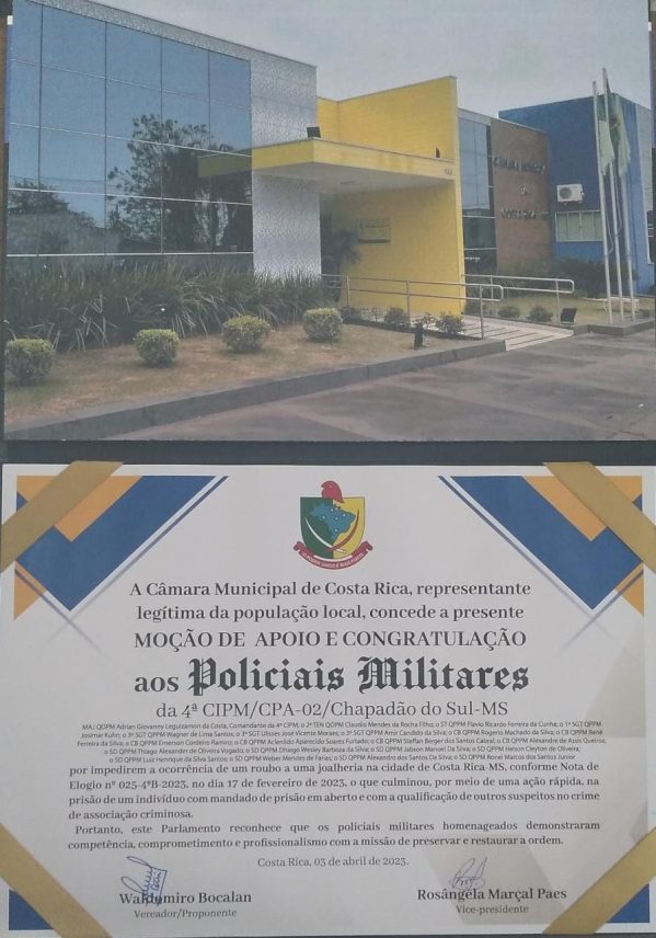 Costa Rica (MS) – Ontem (17/04), o Comandante do 2º Pelotão de Costa Rica, 2º Tenente PM Mendes, recebeu os vereadores, Sr. Waldomiro Bocalan, o “Biri”, e a Sra. Rosângela Marçal Paes, sendo entregue por ambos, uma moção de Apoio e Congratulação, em razão da ação conjunta dos militares da 4ª CIPM, com apoio de outras forças.