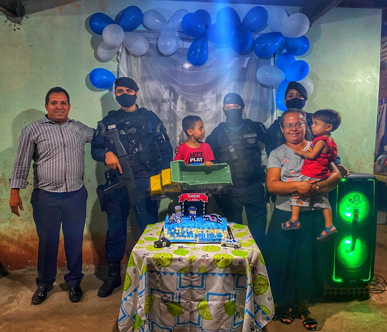 Corumbá (MS) – Isaque, que completou 6 anos, ontem, dia 25 de outubro, sonha em ser policial. O pai do menino, Zilmar da Rosa, teve a ideia de convidar uma guarnição da Polícia Militar do 6ºBPM.