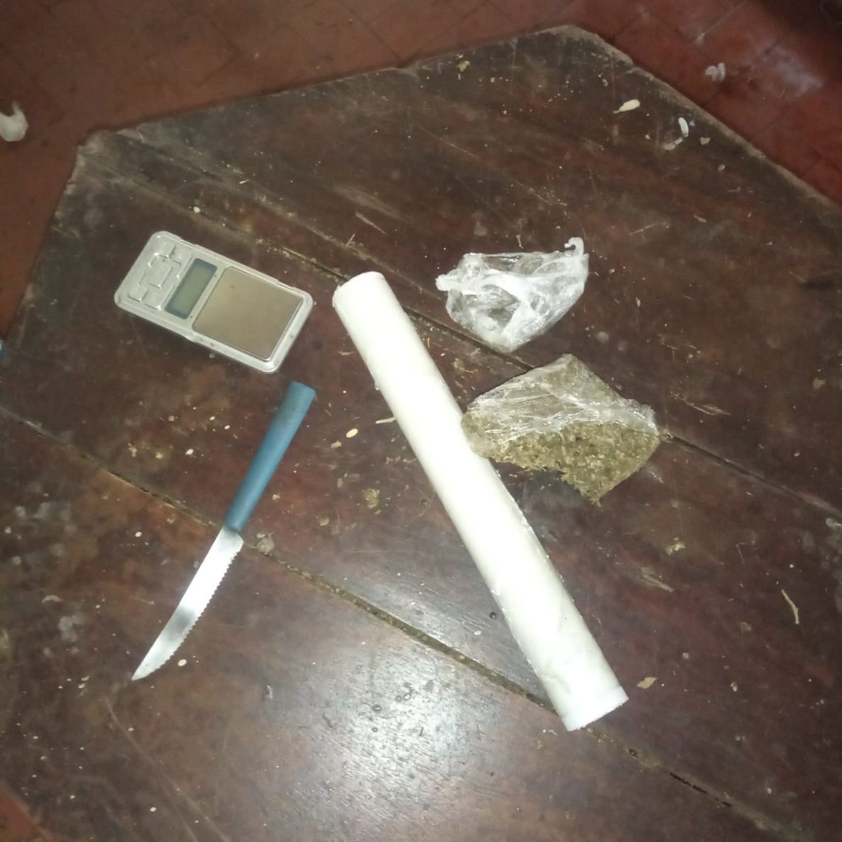 Os policiais adentraram ao imóvel mencionado e constataram a veracidade das declarações, efetuando a apreensão de porções de substância análoga à maconha, uma balança de precisão prateada, uma faca do tipo serra e um rolo de plástico filme. Todos os itens apreendidos foram encaminhados à delegacia competente para os devidos procedimentos legais.