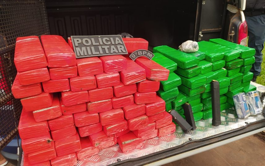 Durante a revista nos objetos, os policiais militares se depararam com uma grande quantidade de drogas (87 quilos), três carregadores de pistola – sendo um alongado – e 124 munições de 9 milímetros.