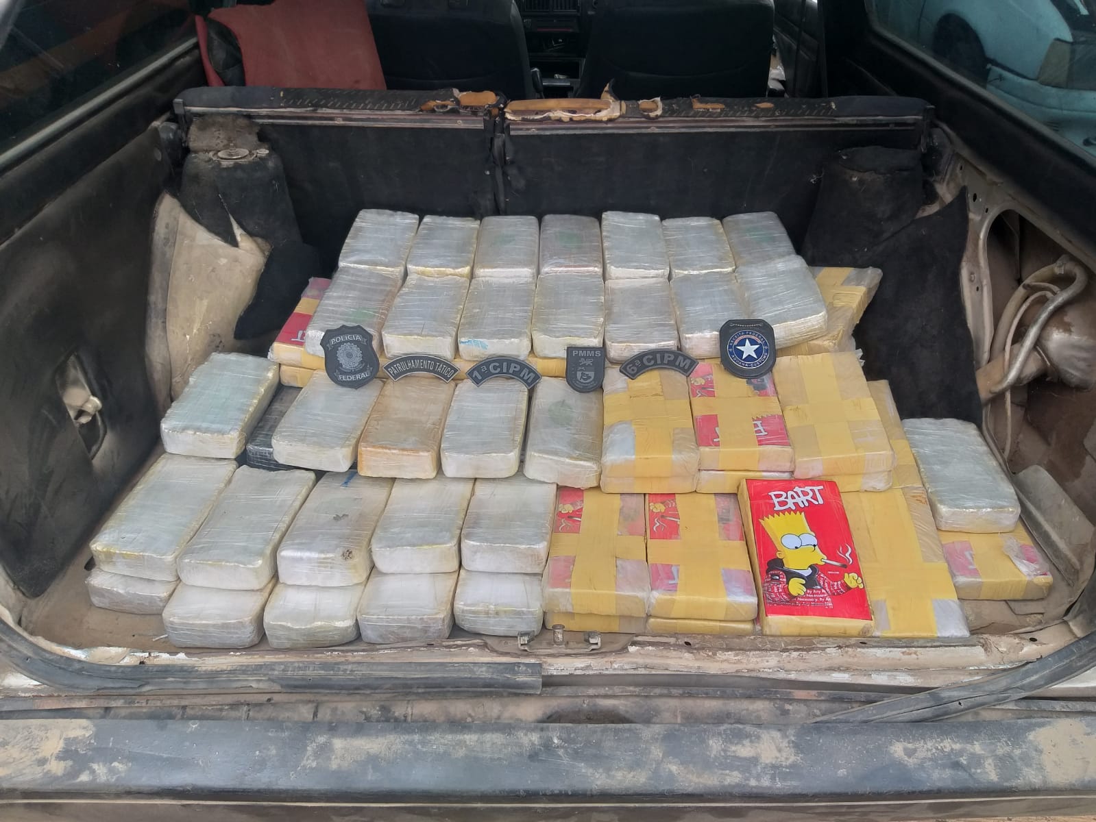 No veículo foram encontrados no porta malas um cobertor tipo manta que cobriam que 70 tabletes de substância análoga a pasta base (71,1kg), e 50 tabletes de substância análoga a cocaína (54,6 kg), totalizando 120 tabletes com total de 125,7 kg de entorpecentes.