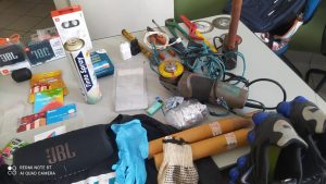 Também no telhado, os policiais encontraram as ferramentas utilizadas pelos autores para furar o cofre da loja, como esmerilhadeira, martelo e luvas.