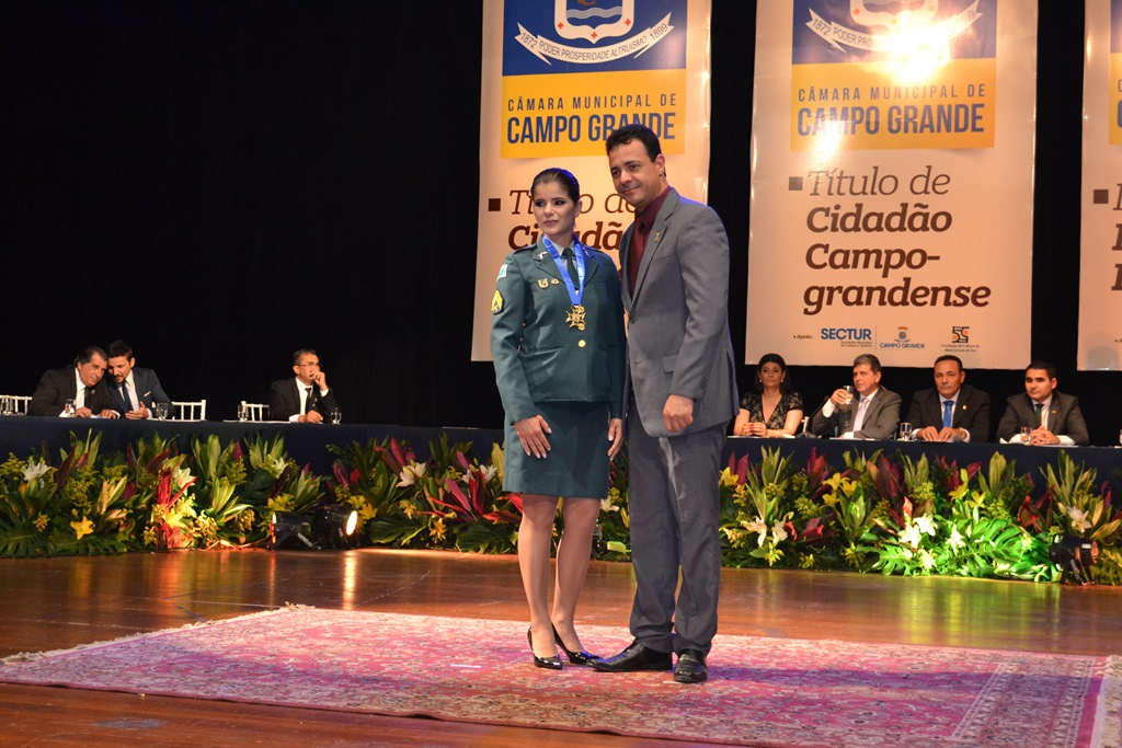 Entre os homenageados que receberam o Título de Cidadão Campo-Grandense está o Subcomandante Geral da PMMS, coronel Valdecir Escalhar e a Presidente do Fundo de Assistência Feminina da PMMS (FAF), Maria Aparecida Galende Acosta. O coordenador militar da PM, coronel Aroldo Luiz Estevão e a 3° Sargento Maria Helena Mendes receberam a Medalha do Mérito Legislativo.