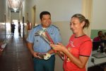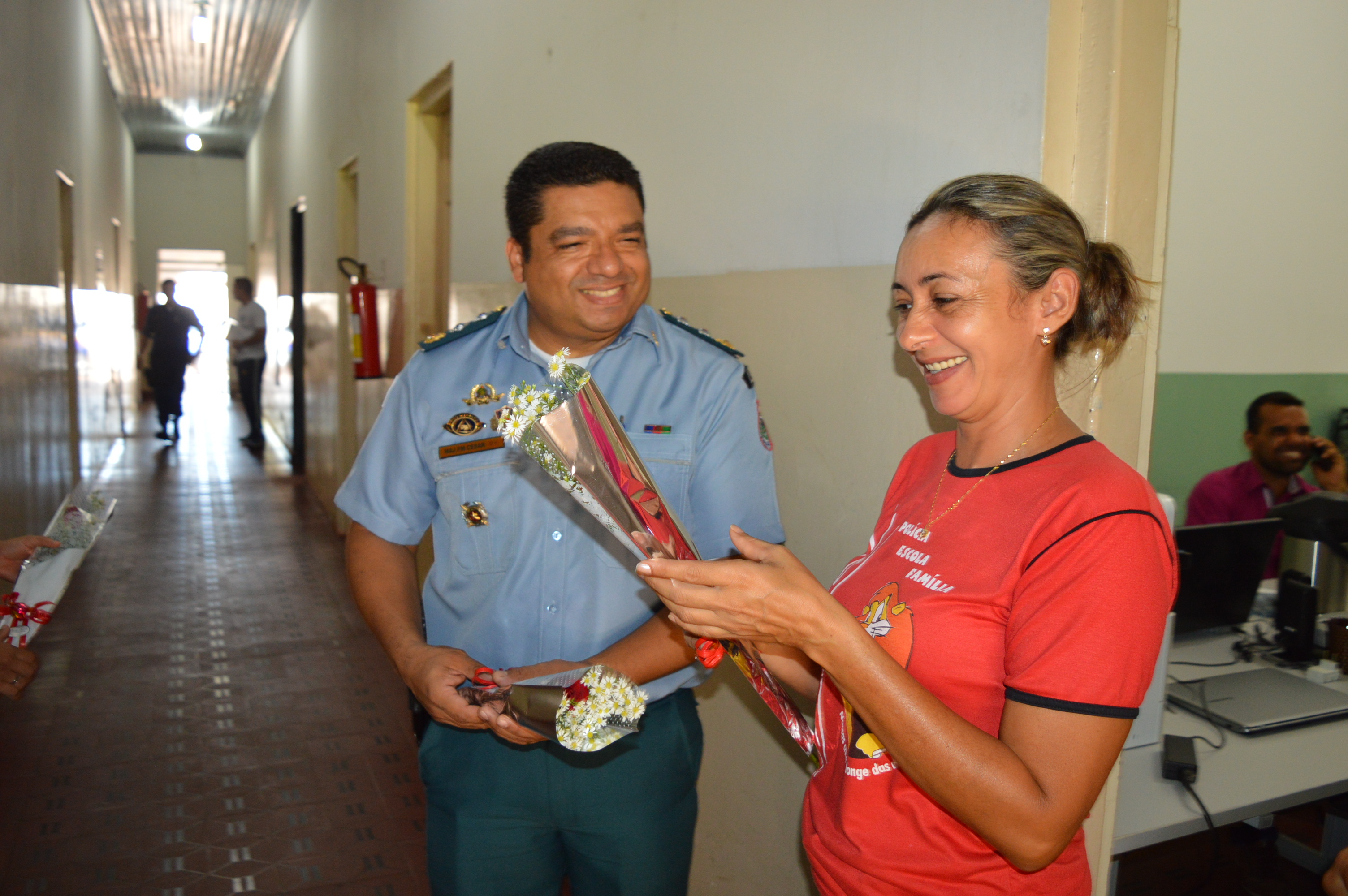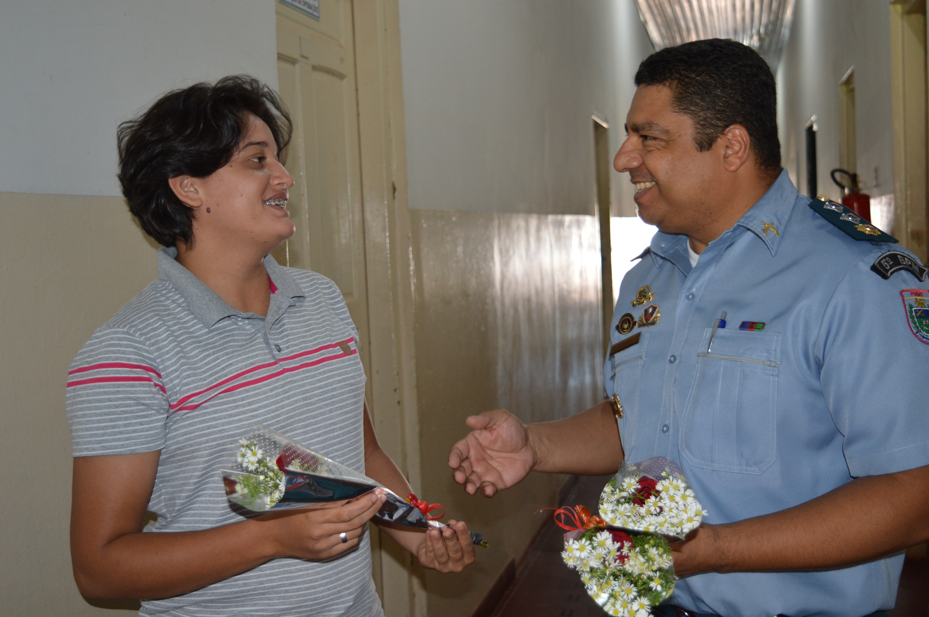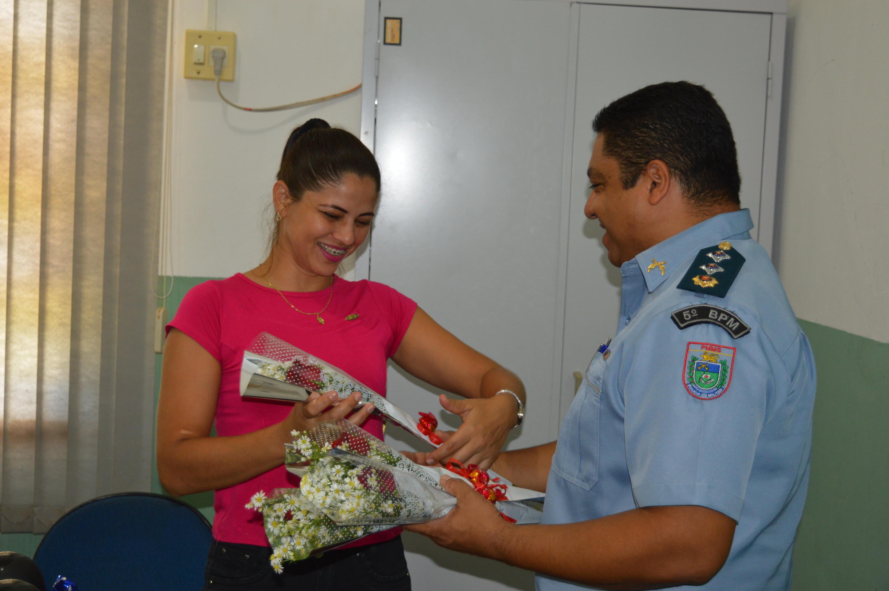 Ao virem trabalhar, o comandante do 5º BPM, Major Luiz César de Souza Herculano entregou um botão de rosa com bombom para as policiais por esta data especial e pelo trabalho que elas desempenham na unidade.