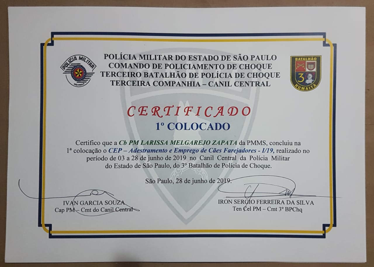Campo Grande (MS) – Nesta sexta-feira (28/06), a CB PM Larissa Melgarejo Zapata, integrante do 1º Batalhão de Polícia Militar do Estado de Mato Grosso do Sul, concluiu na Cidade de São Paulo, com aproveitamento, sendo destaque como 1ª colocada o Curso de Adestramento e Emprego de Cães Farejadores – CEP, realizado no período de 03 a 28 de junho de 2019 no Canil Central da Polícia Militar do Estado de São Paulo, do 3º Batalhão de Policia de Choque.
