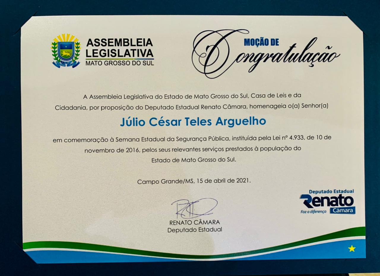 Na transcrição, a moção traz os seguintes dizeres:“A Assembleia Legislativa do Estado De Mato Grosso do Sul, Casa de Leis e da Cidadania, por proposição do Deputado Estadual Renato Câmara, homenageia o Senhor JULIO CESAR TELES ARGUELHO, em comemoração a Semana estadual da Segurança Pública, instituída pela Lei 4.933, de 10 de novembro de 2016, pelos seus relevantes serviços prestados a população do Estado de Mato Grosso do Sul. Campo Grande 15 de abril de 2021. Assina o Deputado Estadual Renato Câmara.”