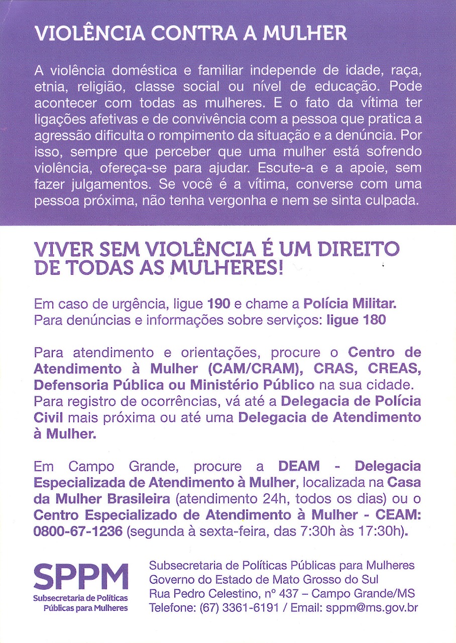 Em Jardim (MS), na manhã de sexta-feira (06) a policial militar também representou o Comandante do 11º BPM no evento de lançamento da campanha Agosto Lilás. O evento contou com a participação da prefeita Clediane Areco Matzenbacher, representantes da Delegacia de Atendimento a Mulher, da Polícia Rodoviária Federal, da Defensoria Pública e da Coordenadoria de Políticas Públicas para Mulheres. Na manhã de segunda-feira (09), foi realizada uma blitz de educativa, onde foram entregues panfletos referentes à campanha.