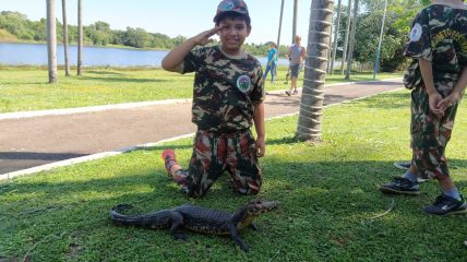 Campo Grande (MS) – As crianças e adolescentes do Projeto Florestinha de Anastácio e Policiais Militares Ambientais realizaram ontem (24) pela manhã, uma atividade educativa de campo no Parque Ecológico da Lagoa Comprida, localizado no município de Aquidauana. Depois de informações de que algumas pessoas descartavam resíduos perigosos, como lâmpadas, pilhas e baterias de eletrônicos nos cestos de lixo do Parque e em suas imediações, as crianças estiveram no local e conversaram com as pessoas sobre as questões ambientais, especialmente relativas aos riscos dos resíduos sólidos ao ambiente. Eles levaram ainda um jacaré taxidermizado (empalhado), para falar da fauna da região.