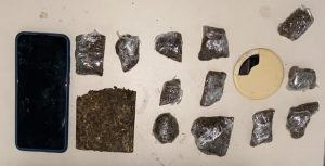 O suspeito confirmou estar cumprindo pena em regime domiciliar, e sobre a denuncia negou e convidou os policiais a olharem a residência. No local havia somente um guarda roupas, uma geladeira, um colchão e um rack de madeira, onde foram localizadas 12 porções de maconha embaladas e prontas para venda e 01 tablete maior da mesma substância sem estar embalada.