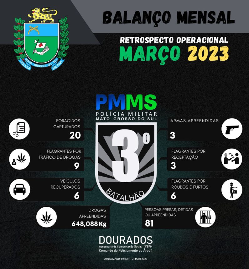 O 3º Batalhão de Polícia Militar de Dourados, nesta sexta-feira (31/03), divulga o balanço das ações desenvolvidas no mês de março deste ano.