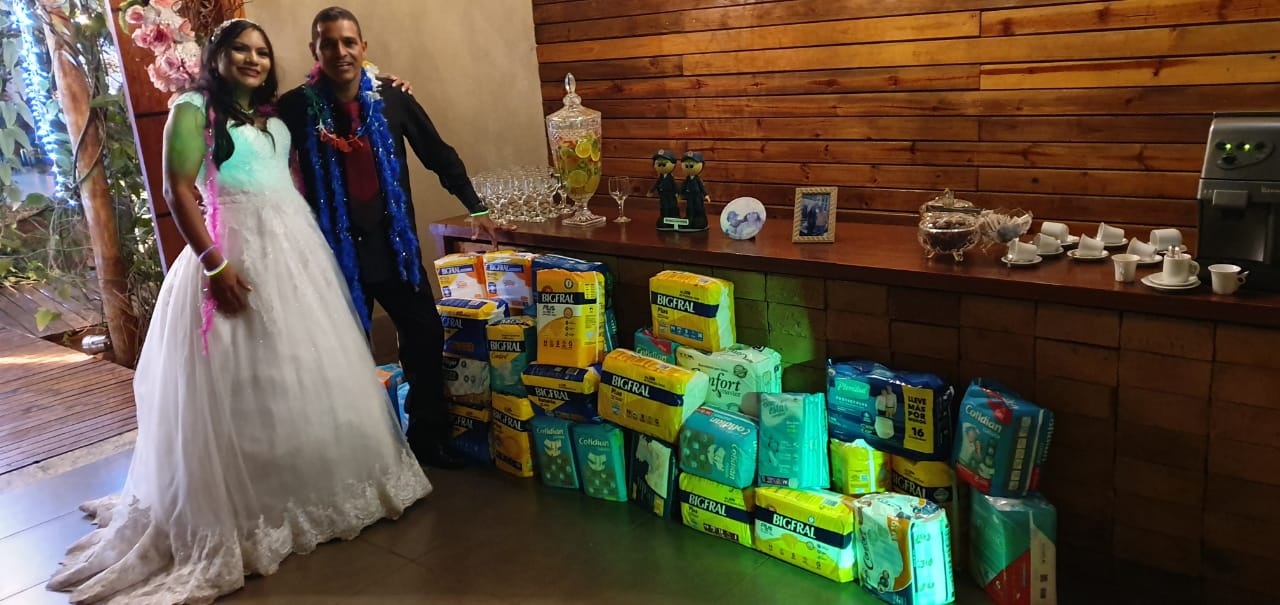 Como forma de gratidão por tudo que conquistaram ao longo de suas vidas, os casados fizeram um pedido muito especial aos convidados, que no lugar dos presentes, fossem levadas fraldas geriátricas que serão doadas para o Asilo São João Bosco.