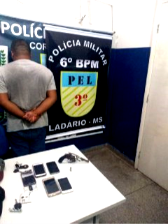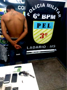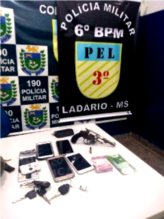 Durante revista minuciosa no veículo, foi encontrado uma arma de fogo de calibre 32 com uma munição intacta e cinco celulares. Questionados sobre a procedência doa aparelhos, informaram que eram roubados. Diante dos fatos, todos foram detidos e conduzidos para a delegacia de polícia civil para esclarecimento, onde ao chegar, os policiais foram informados de que o carro, CELTA DE COR PRATA, que os autores saíram em fuga, também havia sido roubado para dar suporte na fuga após o roubo.