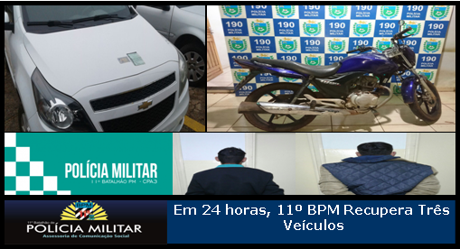 Jardim (MS) – Ontem (19), durante patrulhamento ostensivo e preventivo, os Policiais Militares do 11º BPM recuperaram três veículos e conduziram dois indivíduos por furto de motocicleta. Dois veículos foram recuperados pelos Policiais da Força Tática