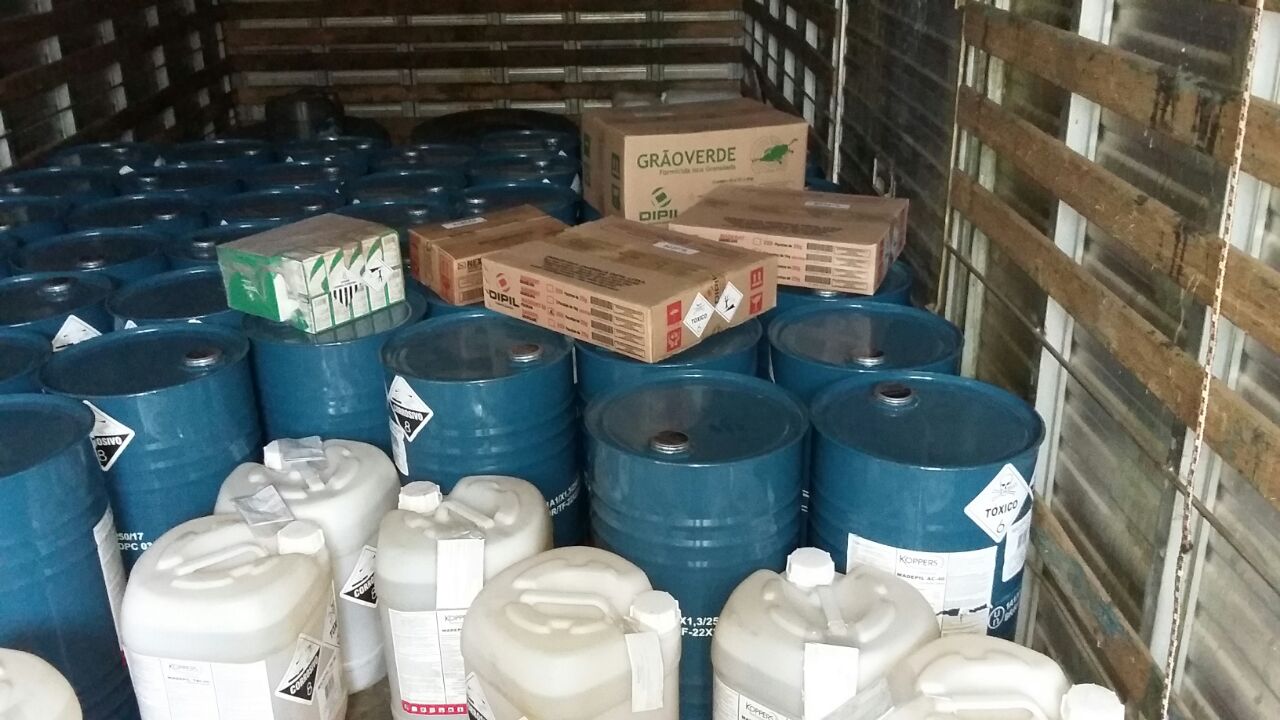 Campo Grande (MS) – Durante fiscalização ambiental no município de Eldorado, Policiais Militares Ambientais de Mundo Novo apreenderam hoje (19) às 16h00, um caminhão do tipo baú, com carga de produtos químicos (produto perigoso) transportada
