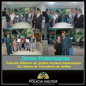 Jardim (MS) – Foi realizada ontem (30), durante a sessão solene na Câmara dos Vereadores de Jardim, uma homenagem aos Policiais Militares do 11º BPM, Subtenente Valterney Santos Pereira, e os integrantes da Força Tática, Cabo Robmar Farinha e Soldado