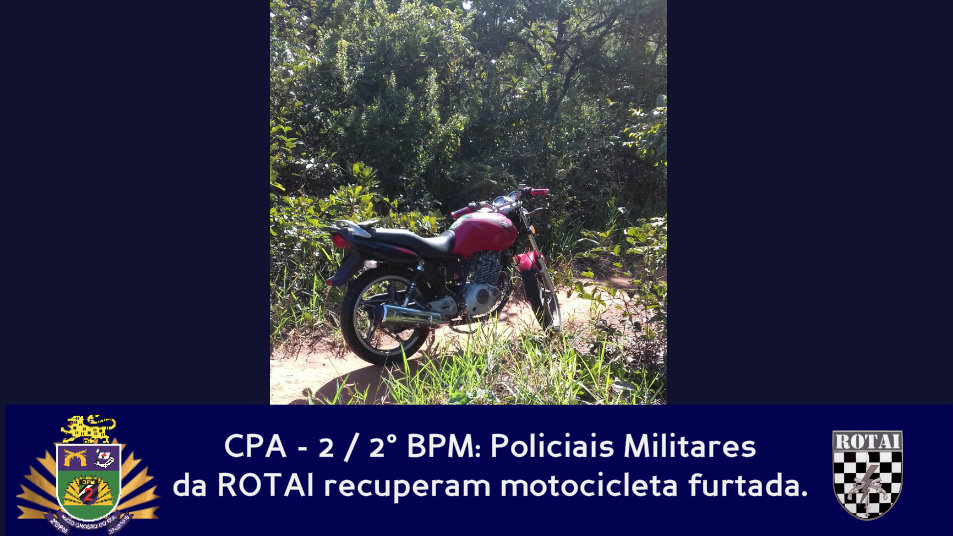 Três Lagoas (MS) – Ontem (23/05), por volta das 13h00 Policiais Militares da ROTAI (Rondas Táticas do Interior) recuperaram uma motocicleta furtada. A guarnição estava em rondas no Bairro Jardim das Orquídeas quando receberam a denúncia de que uma