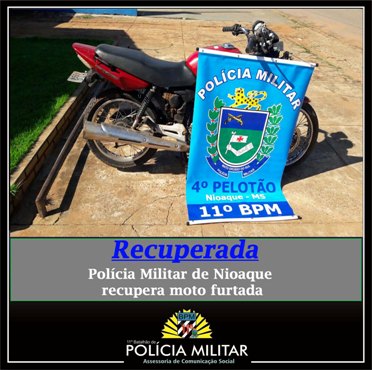 Jardim (MS) – Ontem (23), por volta das 12h30min, a guarnição de serviço da Polícia Militar de Nioaque, fez a recuperação de uma motocicleta Honda CG 150 Titan ESD, de cor vermelha, que foi furtada no último dia 12, no próprio município. Os