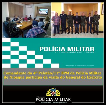 No dia 18 de Maio, o Comandante do 4° Pelotão de Polícia Militar de Nioaque, 2° Tenente PM Joicemir Ferreira Bica, participou da visita oficial do General de Exército Gerson Menando Garcia de Freitas Comandante do Comando Militar do Oeste, e do Chefe do