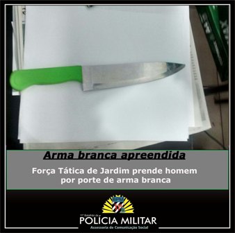 Jardim (MS) – No sábado (06/05), por volta das 02h os policiais militares da Força Tática realizaram a prisão de um homem de 21 anos pelo porte de arma branca (Faca) Durante policiamento ostensivo e preventivo pelas vias da cidade, os policiais