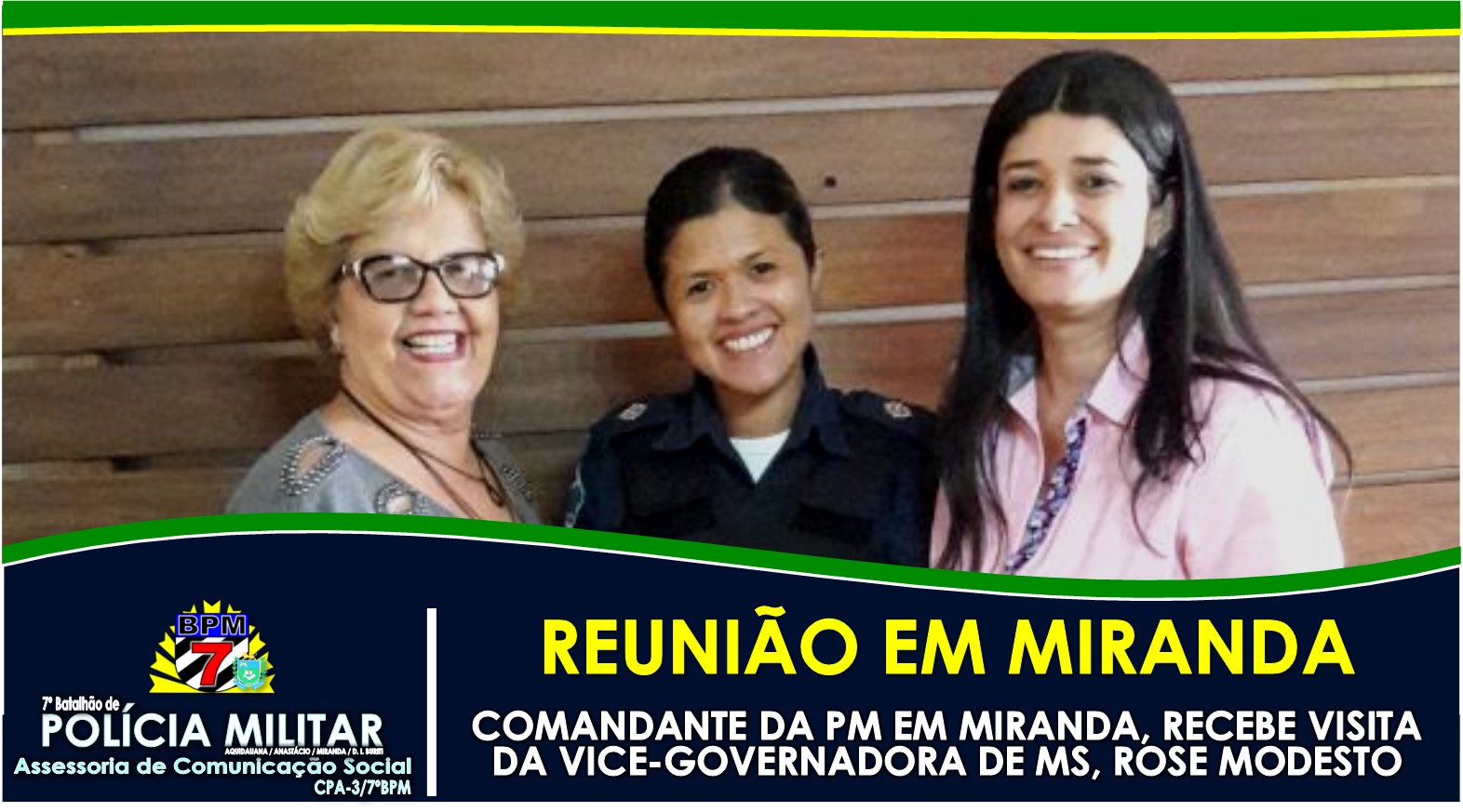 Aquidauana (MS) – Na última semana (28.04), a Tenente Mirna, Comandante da PM em Miranda (Pelotão subordinado ao 7º Batalhão PM), recebeu a visita da Vice-Governadora de Mato Grosso do Sul, Rose Modesto e da Prefeita Municipal da cidade, Marlene Bossay.