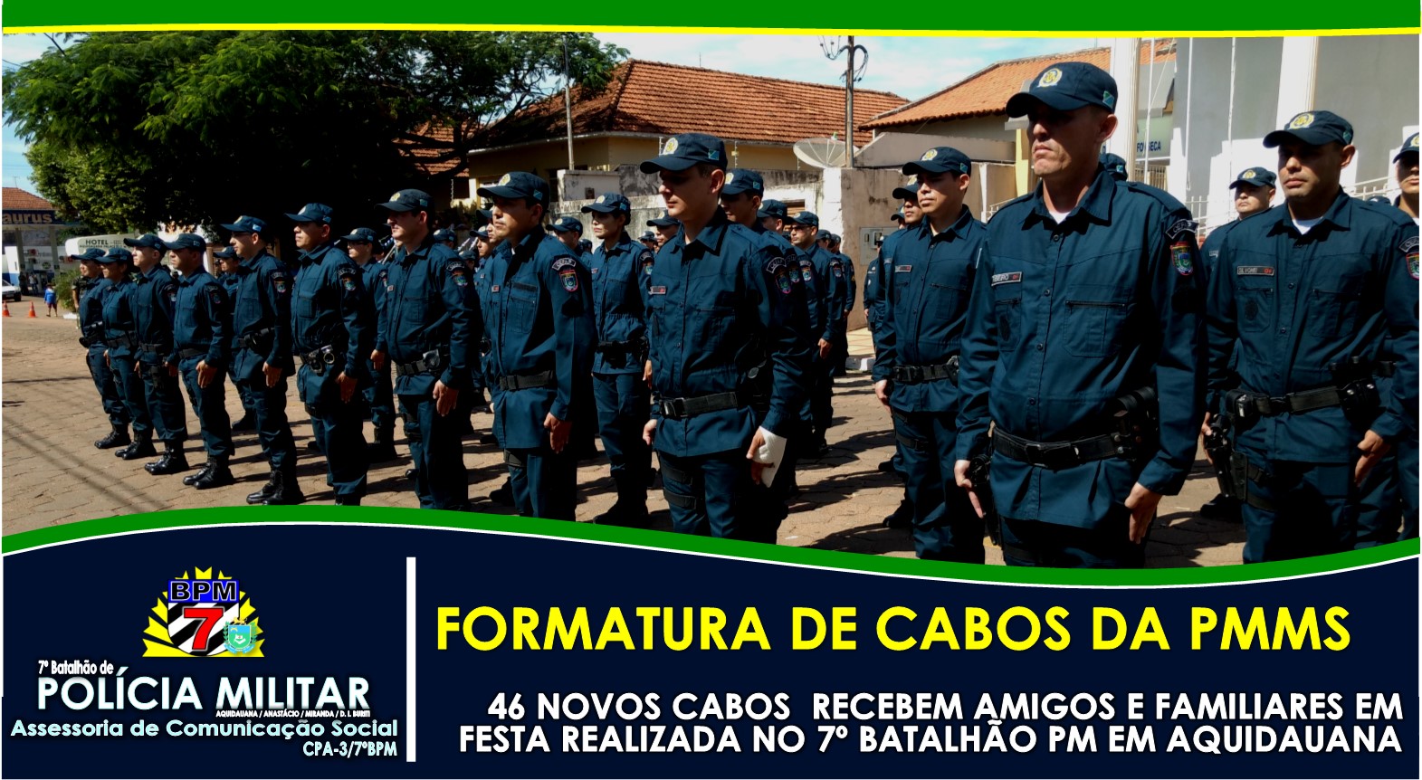 Aquidauana (MS) – Hoje (25.04), 46 novos policiais militares ingressaram na graduação de Cabos da Gloriosa Polícia Militar do Estado de Mato Grosso do Sul. O evento ocorreu na Sede do 7º BPM, e contou com a presença dos amigos e familiares dos