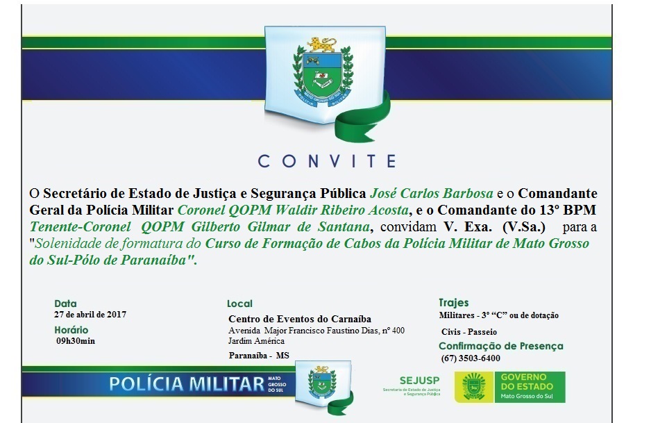 O Secretário de Estado de Justiça e Segurança Pública, José Carlos Barbosa, o Comandante Geral da Polícia Militar, Coronel Waldir Ribeiro Acosta, e o Comandante do 13º Batalhão, Tenente Coronel Gilberto Gilmar de Santana, convidam a toda a população