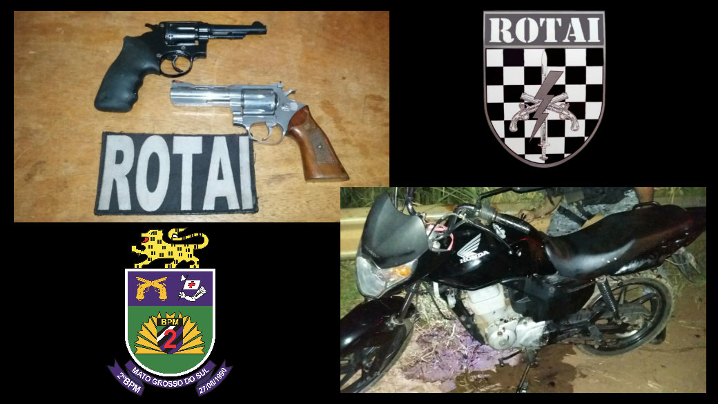 Três Lagoas (MS) – Ontem (24/03) por volta das 22h30min Policiais Militares da ROTAI (Rondas Táticas do Interior) do 2º Batalhão recuperaram uma moto roubada e apreenderam 2 (dois) revólveres calibre 38. A guarnição da ROTAI obteve