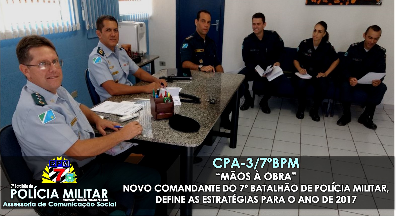 Aquidauana (MS) – Hoje, (21.03) o tenente-coronel PM Airton Leonel Praeiro, novo Comandante do 7º Batalhão de Polícia Militar, reuniu-se com sua equipe de Oficiais, para definir as estratégias para o ano de 2017. A reunião ocorreu nas instalações da