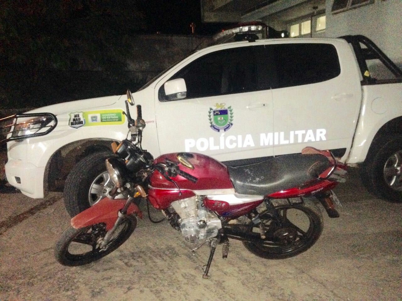 Corumbá (MS)- Neste domingo 12/02 a equipe da Polícia Militar em rondas ostensivas preventivas pelo bairro Cravo Vermelho, quando por voltas das 20h30min a equipe avistou uma motocicleta na rua 07 de setembro, ao avistar a equipe o mesmo mudou de direção.