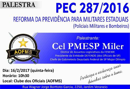 Campo Grande (MS) – Todos os policiais e bombeiros Militares estão convidados a participarem da palestra sobre a PEC 287/2016 que trata da reforma da Previdência para Militares Estaduais (PM e BM), que será realizada na Associação