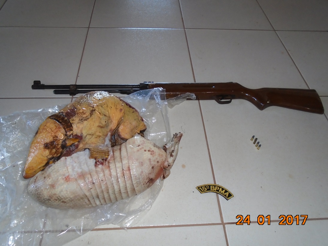 Campo Grande (MS) – Policiais Militares Ambientais de Cassilândia realizaram atendimento a denúncia de caça ontem (24) à tarde, em uma fazenda e chegando ao local encontraram e apreenderam dois tatus abatidos, uma espingarda de pressão modificada