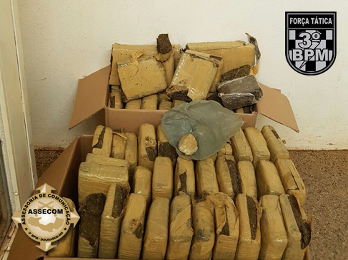 Deodápolis- MS, durante policiamento no terminal rodoviário da cidade, na noite desta segunda-feira (19), em abordagem ao ônibus da Viação São Luiz, que faz o itinerário Ponta Porã/Três Lagoa, foram localizadas duas malas com substância prensada