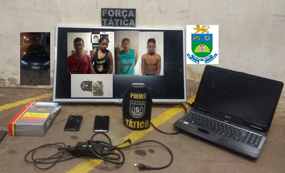Campo Grande (MS)- Policiais Militares do Tático do 9°BPM prenderam nesta quarta (7), dois homens e uma mulher com as idades entre vinte e três e quarenta e um anos, e apreenderam um adolescente de dezessete anos, no Bairro jardim Presidente. Por volta das