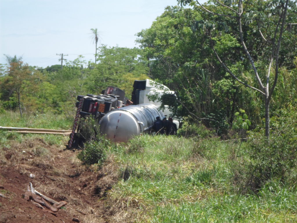 Campo Grande (MS) – Desde ontem (4), Policiais Militares Ambientais de Campo Grande realizam vistoria e acompanharam o processo de descontaminação do solo, referente a um acidente com um caminhão Volvo acoplado a uma carreta bitrem do tipo tanque, às