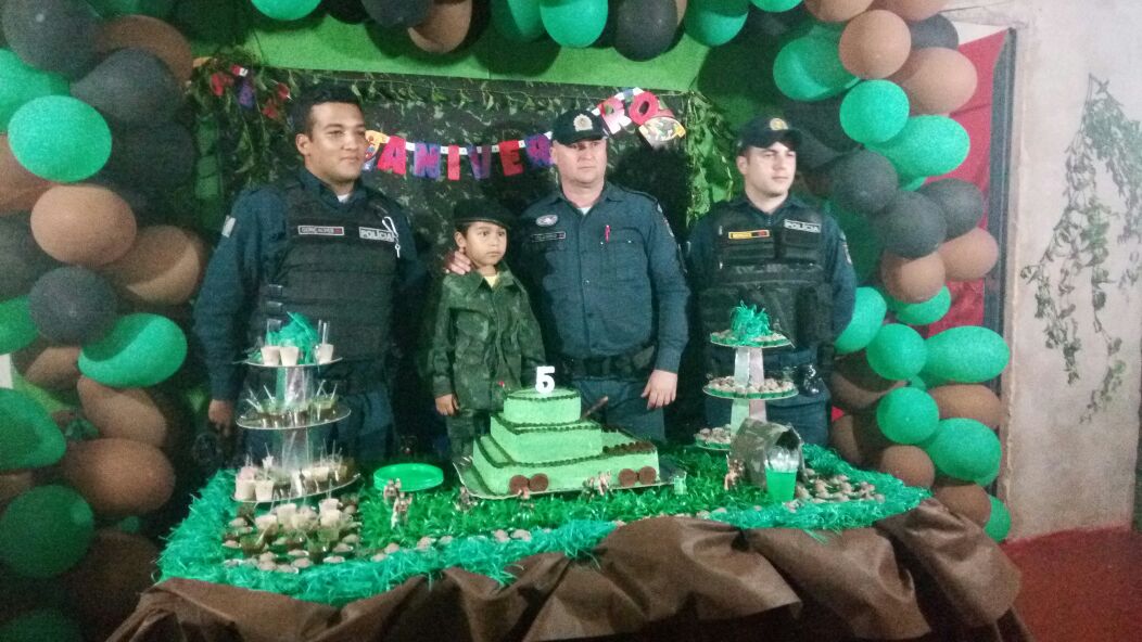 Darlington completou 5 (cinco) anos na noite do último sábado (22), e teve o “Exército” como tema de sua festa de aniversário. Como presente, o pequeno pediu a seus pais que a Polícia Militar pudesse estar presente em sua festa. A família entrou em