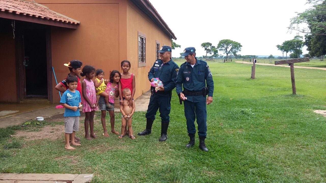 Coxim (MS) – Policiais Militares da Patrulha Rural realizaram ontem (12) entrega de balas e pirulitos para as crianças das fazendas do município de Sonora. Um dia muito legal, foi o que disseram as crianças que receberam balas e pirulutos dos policiais.