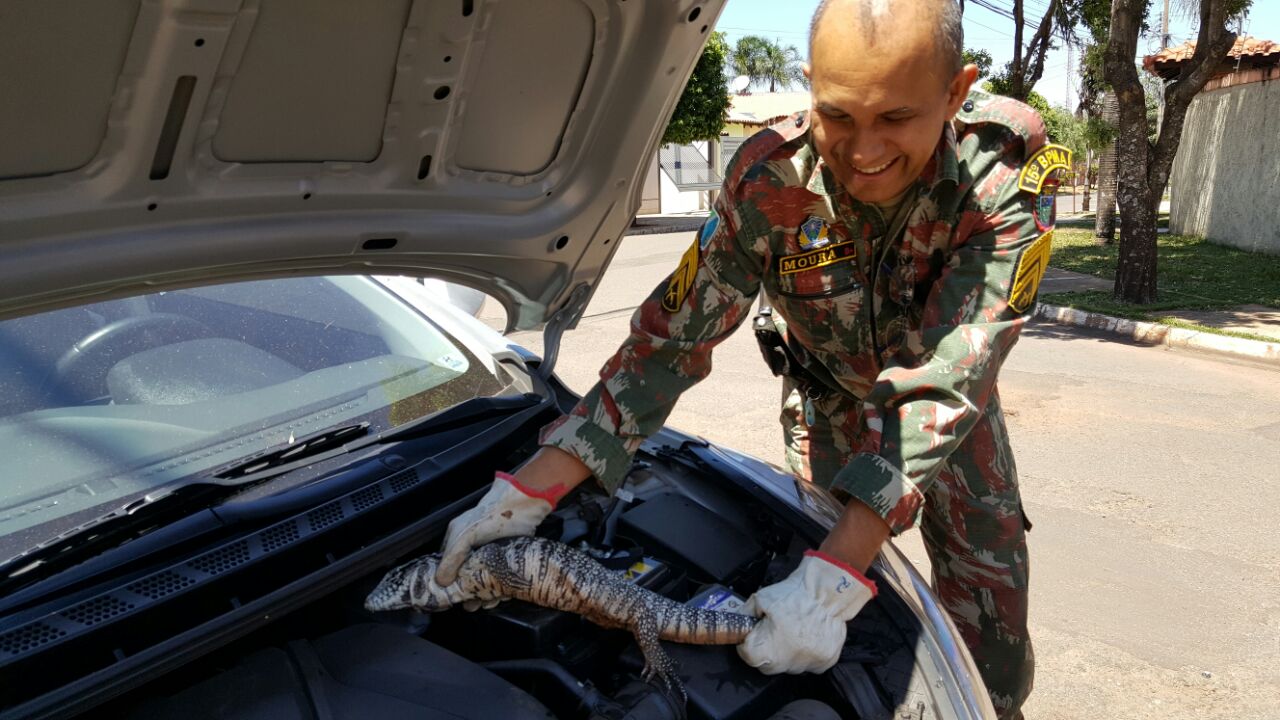 Campo Grande (MS) – Policiais Militares Ambientais de Campo Grande foram chamados por volta das 12h00 de hoje (21) para atender a uma ocorrência relativa a um animal silvestre da espécie teiú que estaria sobre o motor de um veículo, embaixo do