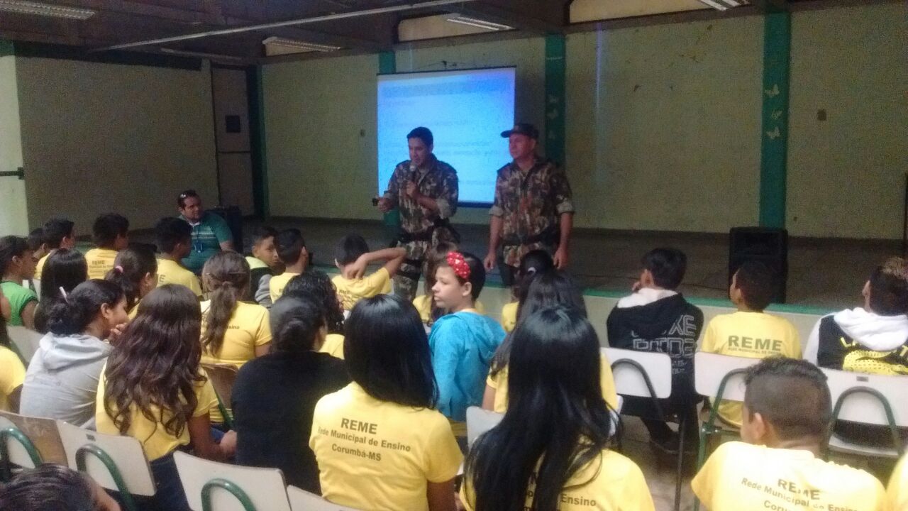 Campo Grande (MS) – Policiais Militares Ambientais de Corumbá realizaram palestras sobre temas ambientais para alunos do 6º a 9º ano do Centro de Atendimento Integral a Criança (CAIC) Padre Ernesto Sassida, totalizando 170 crianças e adolescentes