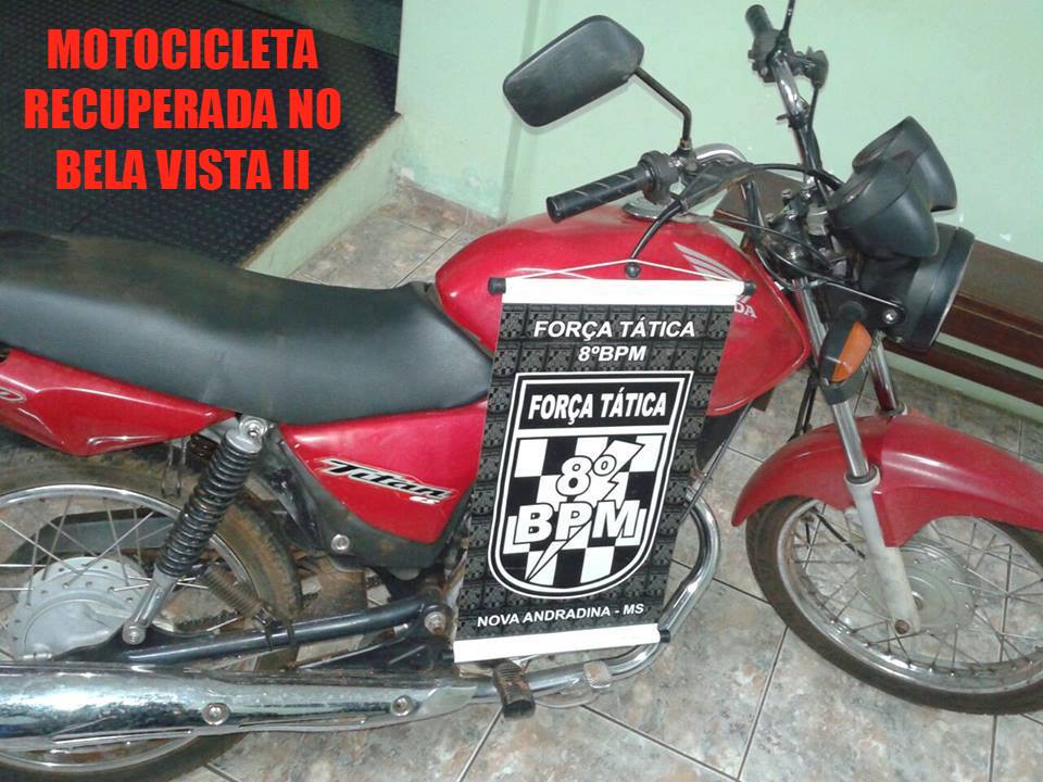 Nova Andradina (MS) – Nesta madrugada (18), por volta das 0h10min, uma equipe da Polícia Militar de Nova Andradina, por meio da força tática recuperou uma motocicleta com queixa de furto no Bairro Bela Vista II. Com denúncia e informações os policiais