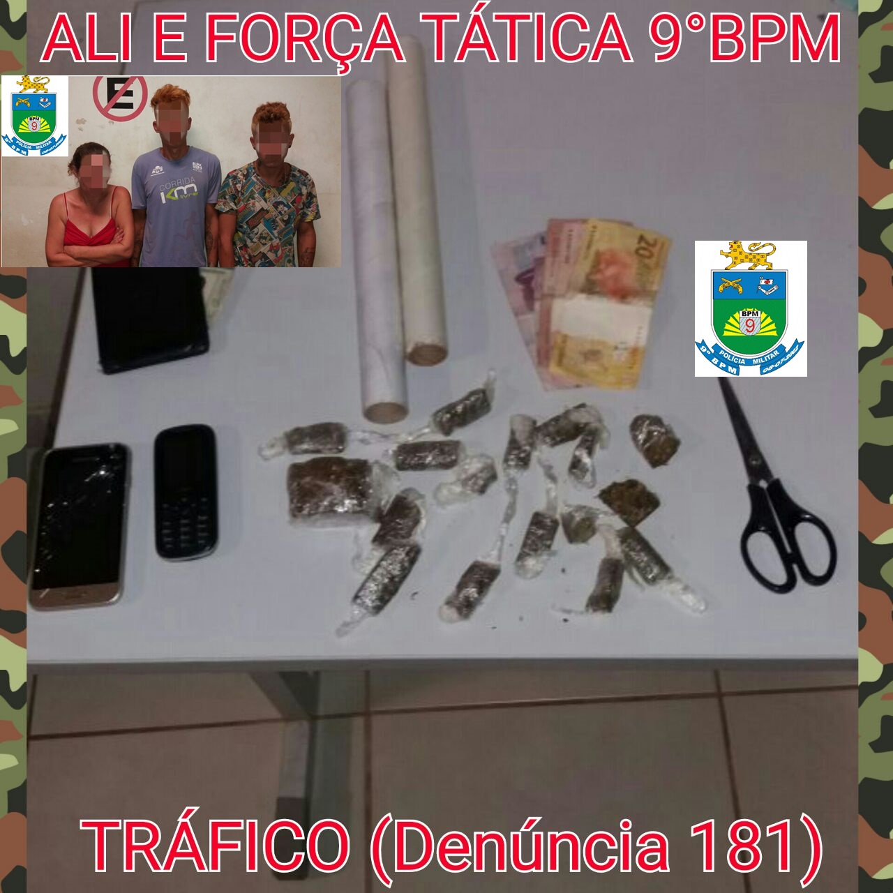 Campo Grande (MS)-Policiais Militares da Força Tática e do Serviço de Inteligência do 9° BPM, prenderam nesta terça (16), três homens com as idades respectivas de vinte, vinte e dois e vinte e quatro anos, e ainda, uma mulher com a idade de quarenta e