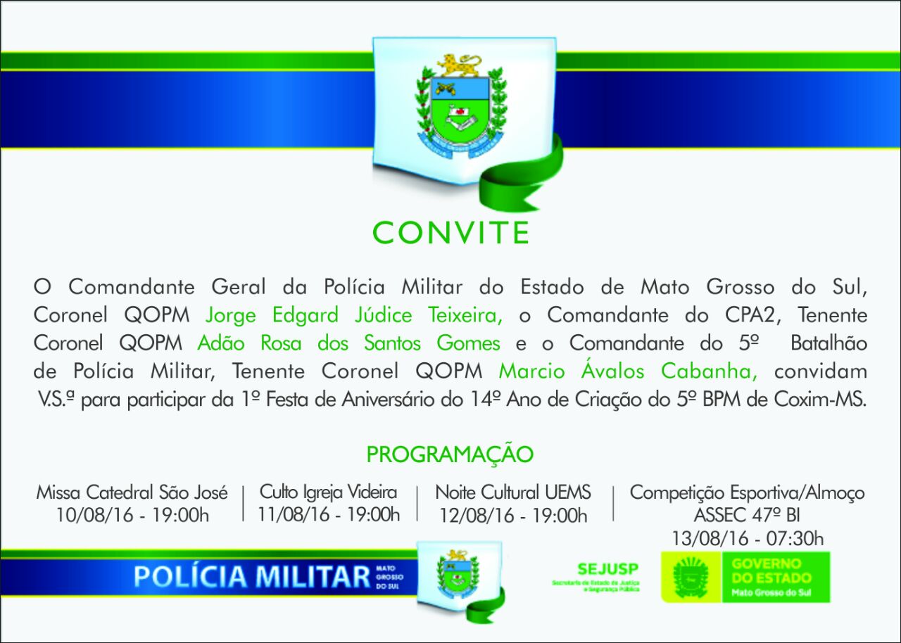 Coxim (MS) – A Polícia Militar inicia hoje (10) a programação dos eventos comemorativos ao 14° Aniversário do 5° BPM de Coxim. Na programação religiosa acontecerá hoje às 19:00 horas (10) na Igreja São José a missa e amanhã (11)também as 19:00
